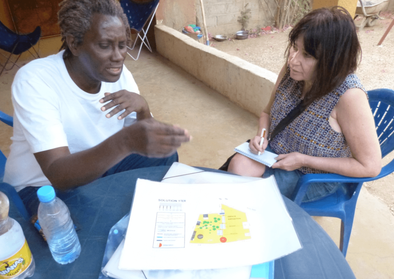Bassirou Sarr présentant à Sylvie le plan d’aménagement du Village